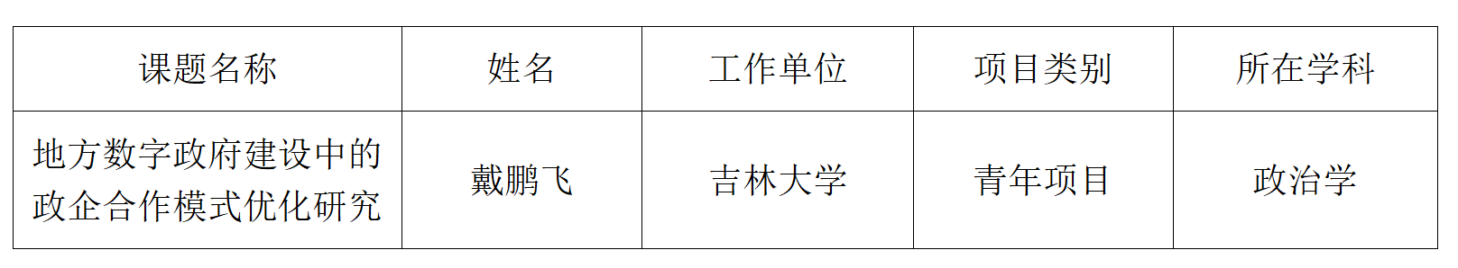 2025年9月5日,国家社会科学基金年度项目和青年项目立项结果公布,吉林大学“中国式现代化道路的政治学阐释”创新团队成员、鼎新学者博士后戴鹏飞获批青年项目,其题目为《地方数字政府建设中的政企合作模式优化研究》。国家社科基金青年项目是由国家社科基金委员会专项资助,旨在支持青年学者在各自研究领域内开展创新性、切实可行的研究,推动人文社会科学领域的发展。获批该项目代表在该领域的研究成果在国内已达到领先水平。