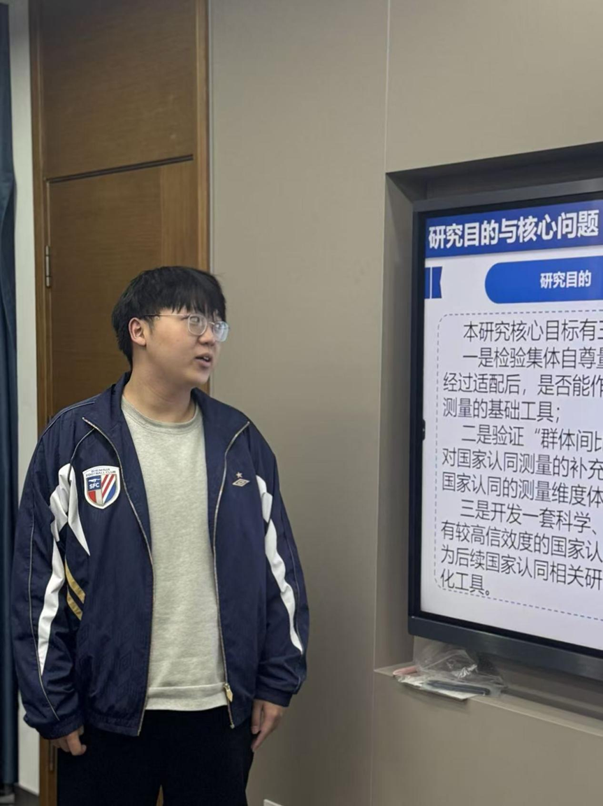 唐恩泽同学汇报了“Measuring national identity”一文的主要内容。唐恩泽同学指出,文章基于社会认同理论,通过实证研究方法,改进了集体自尊量表在国家认同测量中存在的维度缺失与场景适配不足问题,明确了量表在国家语境下的稳定性,阐述了“群体间比较”对完善国家认同测量体系的重要作用。唐恩泽结合文章指出,本研究弥补了传统测量工具的缺陷,为国家认同的测量提供了新的价值。最后,唐恩泽同学认为,国家认同的测量不仅要关注内部比较,也要重视外部关联。